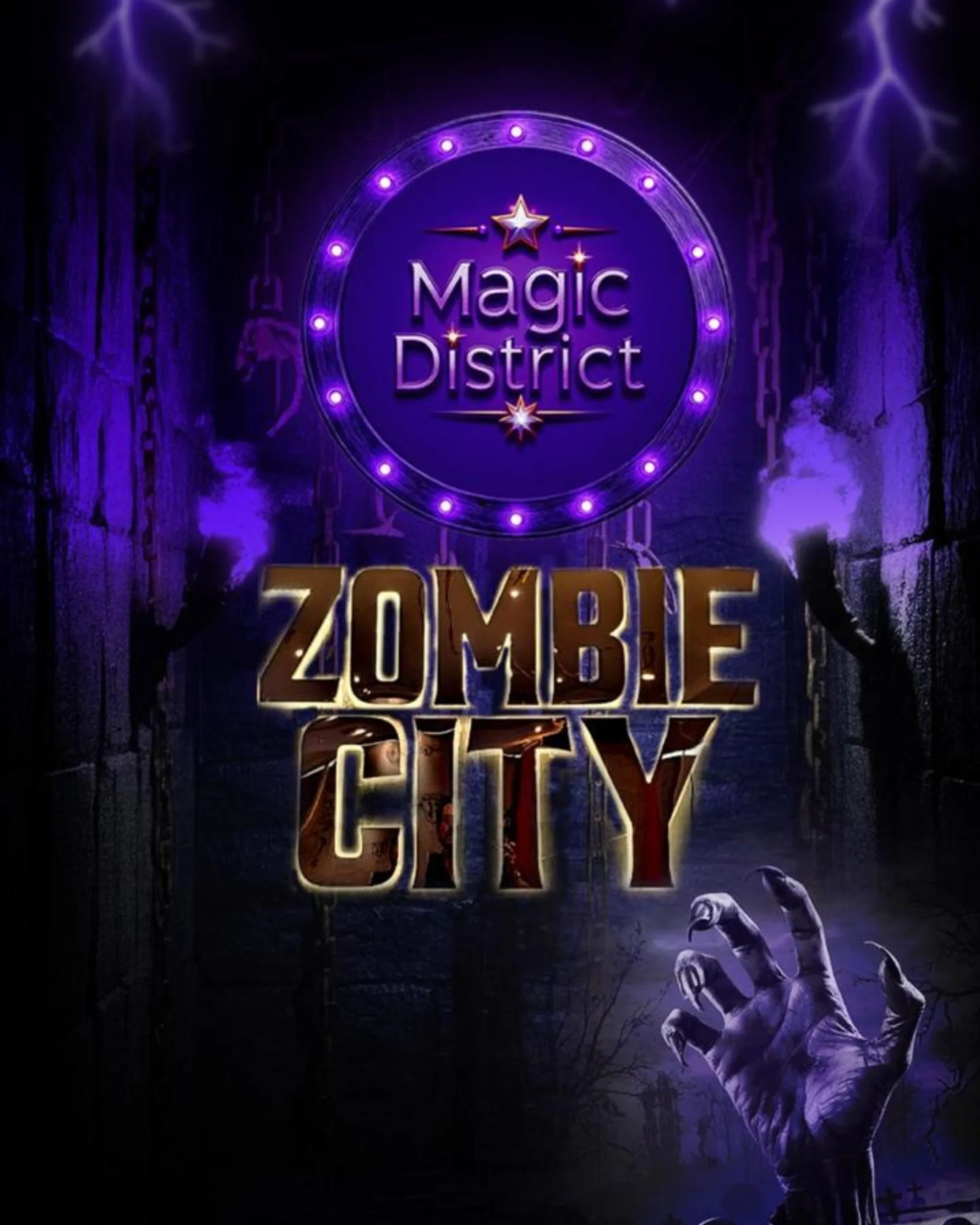 Enter a 10,000 sq. ft. post-apocalyptic world built with broken structures, eerie streets, and cinematic effects. Zombie City combines horror, humor, and high-tech illusions, featuring over 25 live-action zones, sudden encounters, witch-trial alleys, abandoned hospitals, and more.