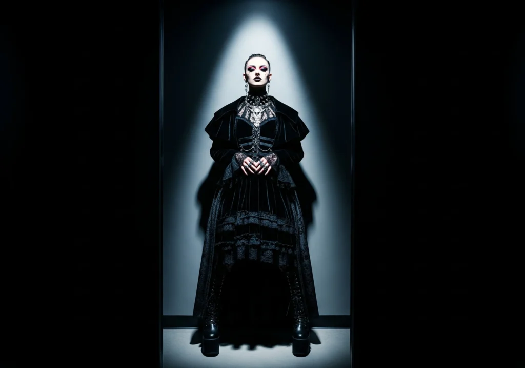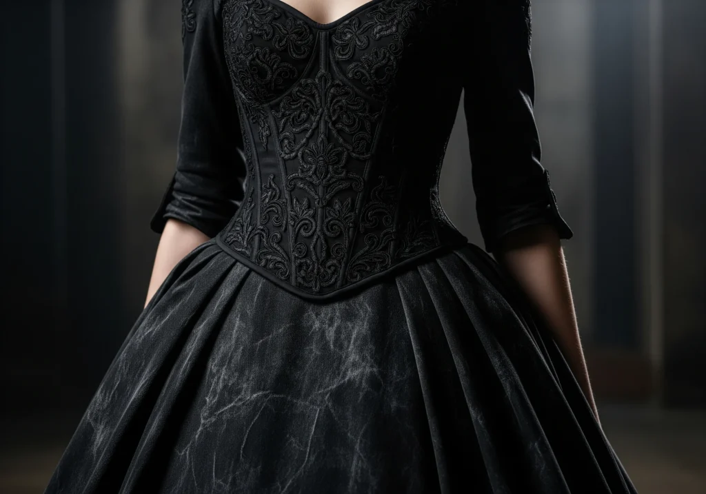 Dramatic gowns shaped with textured fabrics and detailed finishes, echoing the immersive horror settings and atmospheric visuals of Magic District.