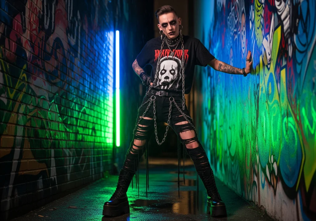Layered fabrics, rugged cuts, and bold silhouettes influenced by the abandoned alleys and eerie walk-through zones found inside the experience.