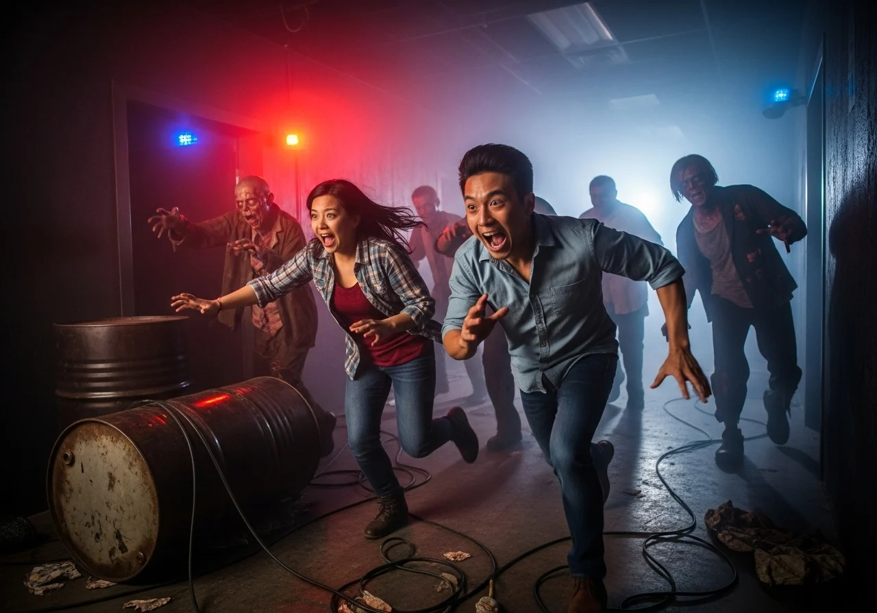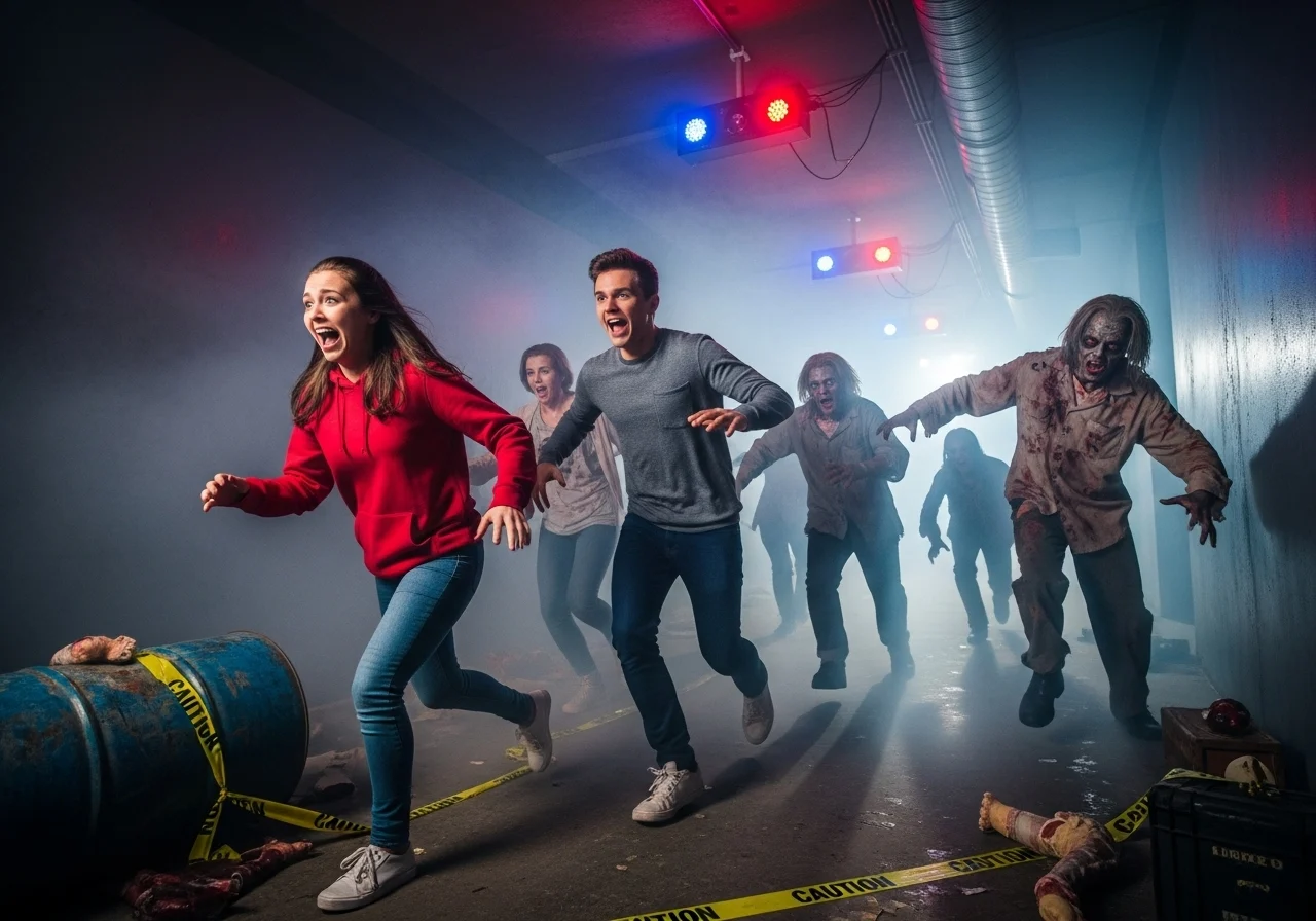 Enter a 10,000 sq. ft. post-apocalyptic world built with broken structures, eerie streets, and cinematic effects. Zombie City combines horror, humor, and high-tech illusions, featuring over 25 live-action zones, sudden encounters, witch-trial alleys, abandoned hospitals, and more.